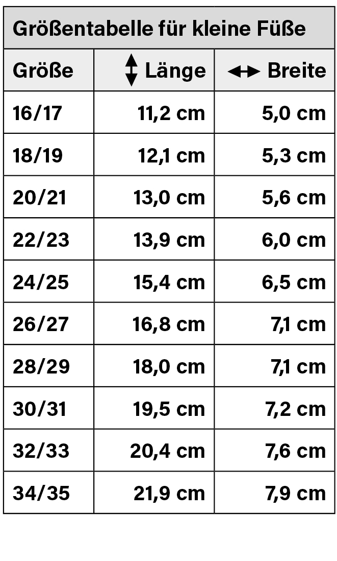 Zur Ermittlung der passenden Größe können Sie auch gerne den ausgestreckten Kinderfuß von der Ferse bis zum großen Zeh messen.