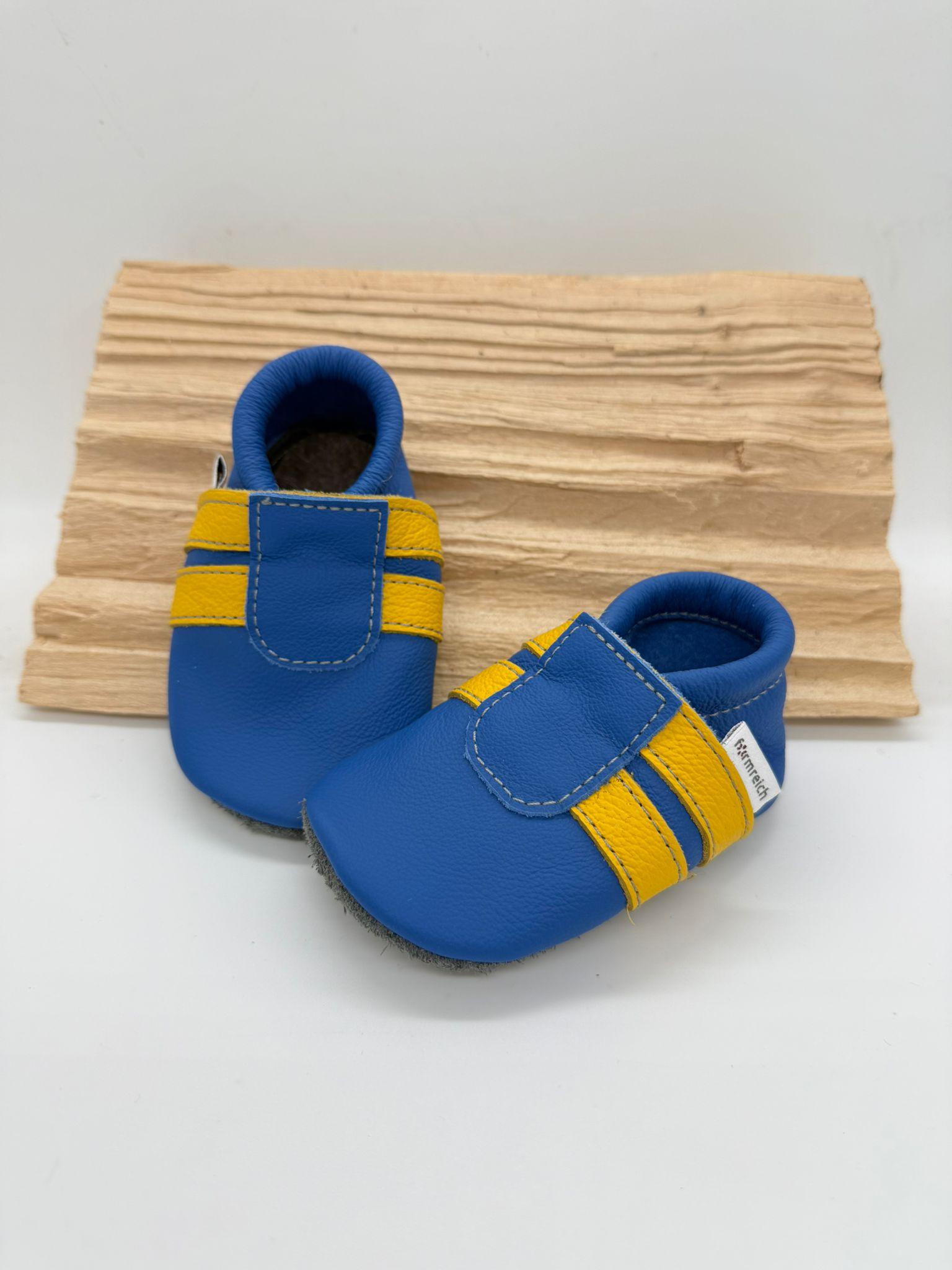 Unsere Krabbelschuhe in Blau-Gelb bieten in der Größe 18/19 optimalen Komfort für kleine Kinderfüße. Hergestellt aus hochwertigem Leder, sind sie strapazierfähig, flexibel und atmungsaktiv. Das weiche Leder macht die Krabbelschuhe zur idealen Wahl für Alltag und Spielzeit.