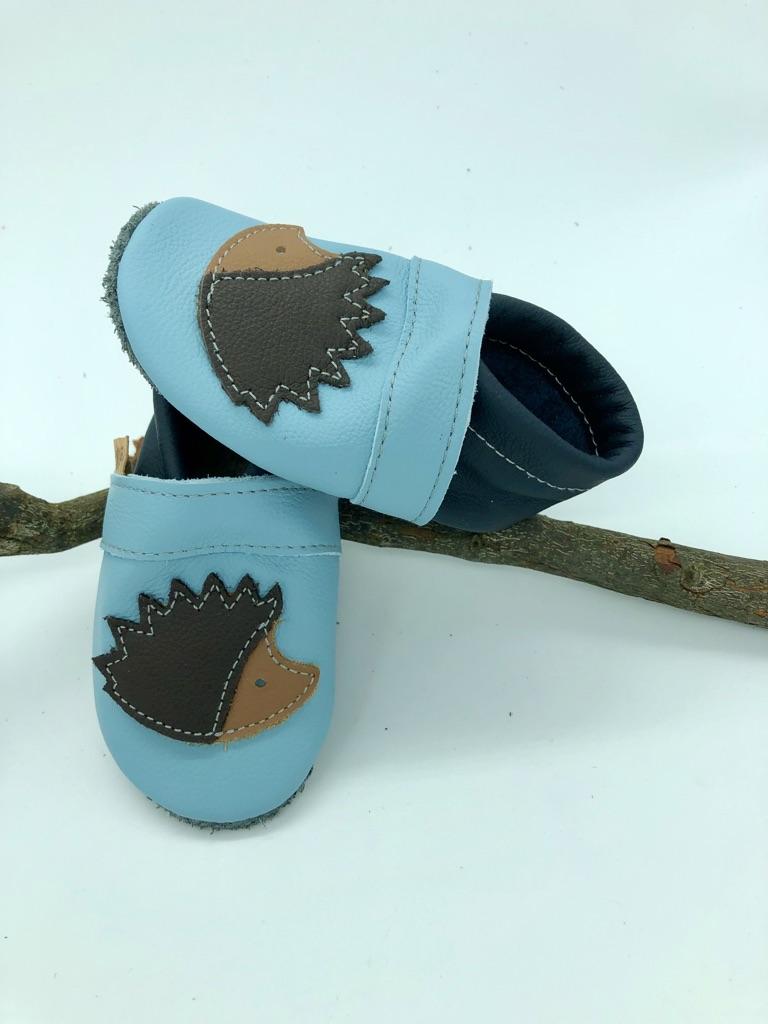 farbenfrohe Krabbelschuhe im Igel Design auf hellblauen Grund