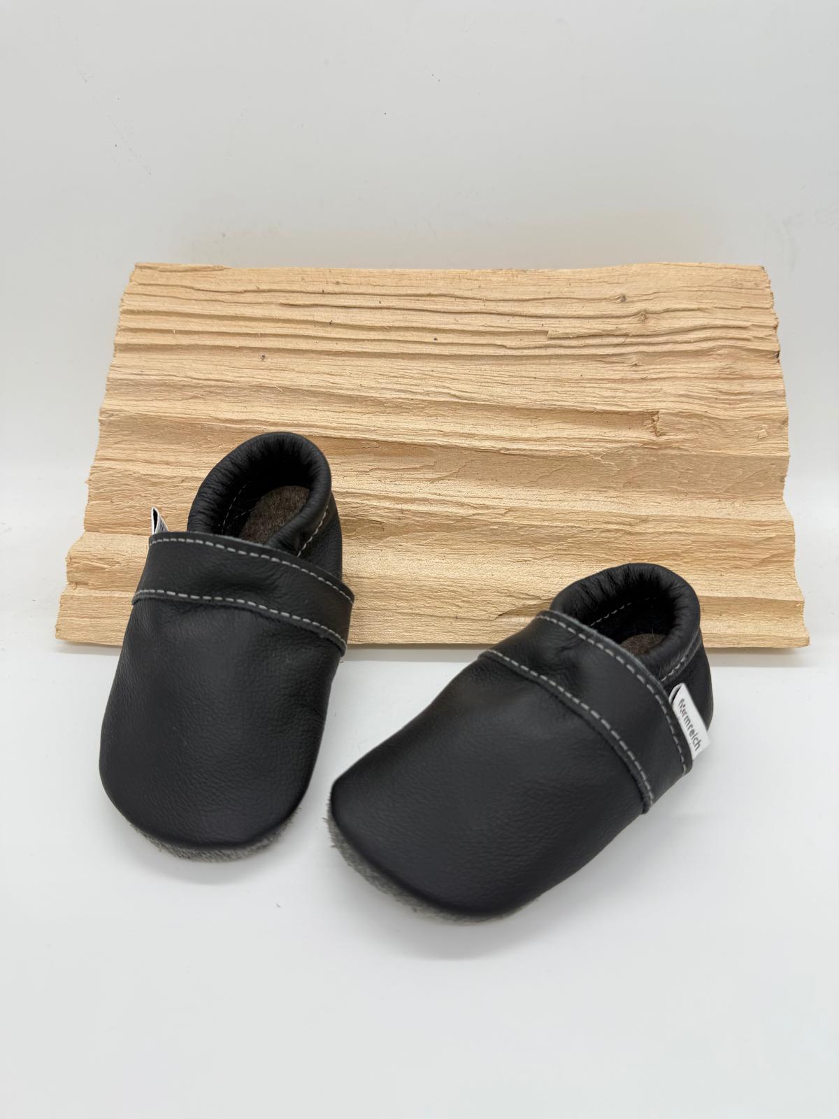 Unsere Lederpuschen in klassischem Schwarz sind in der kleinen Größe 18/19 im SALE erhältlich und ideal für die ersten Krabbelversuche. Das weiche Leder passt sich optimal an, ist strapazierfähig und atmungsaktiv.